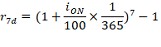 а) Базовый расчёт на основе ставки «овернайт» Национального банка: используется актуальная процентная ставка по депозитам «овернайт» Национального банка на день T. На основе этой ставки рассчитывается эффективная доходность за 7 календарных дней при ежедневном компаундинге (сложного процента) на базе 365дней: – ставка депозита «овернайт», в % годовых